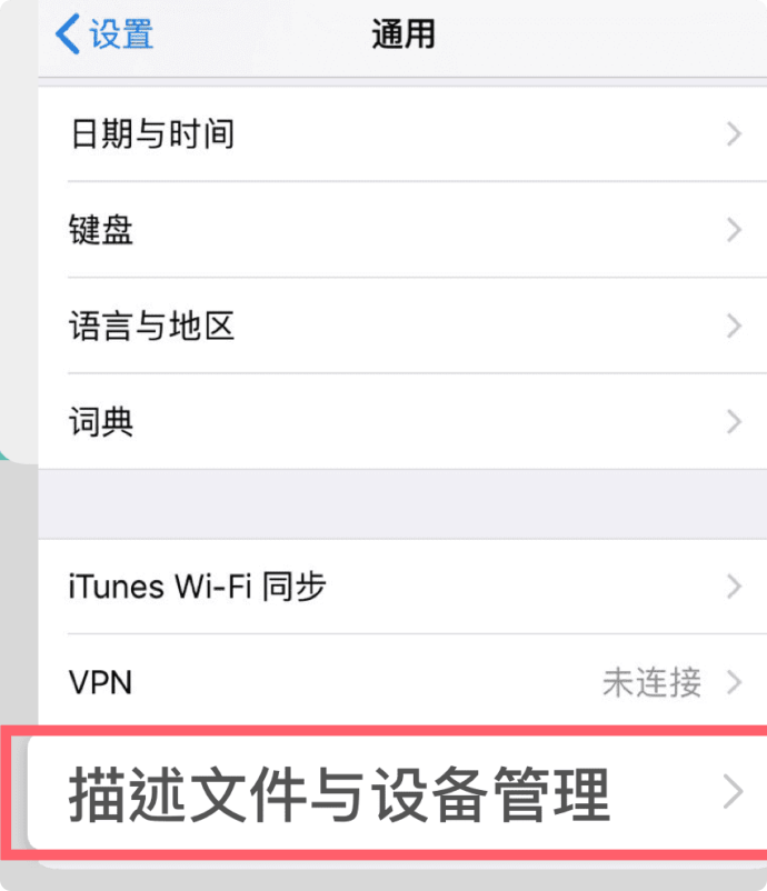 第三步:进入通用,点击 描述文件与设备管理